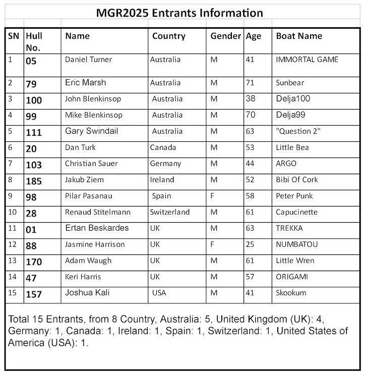 Femton skeppare, varav två är kvinnor, deltar i racet runt jorden. Åtta olika nationer är representerade i flottan. Lista: Ocean Frontiers OGR/GGR/CG580
