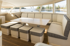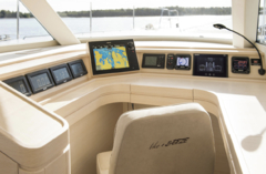 Det märks att båten är byggd med våra nordiska vintrar i tanken, med en väldigt mysig navstation i salongen där man enkelt kan kontrollera alla funktioner utan att behöva gå ut i nordisk kyla eller, som i detta fallet, gassande karibisk sol. Salongen har fönster runt om hela horisonten och är en fantastiskt fin social yta. Ett större vardagsrum än de flesta av oss egentligen behöver eller har.