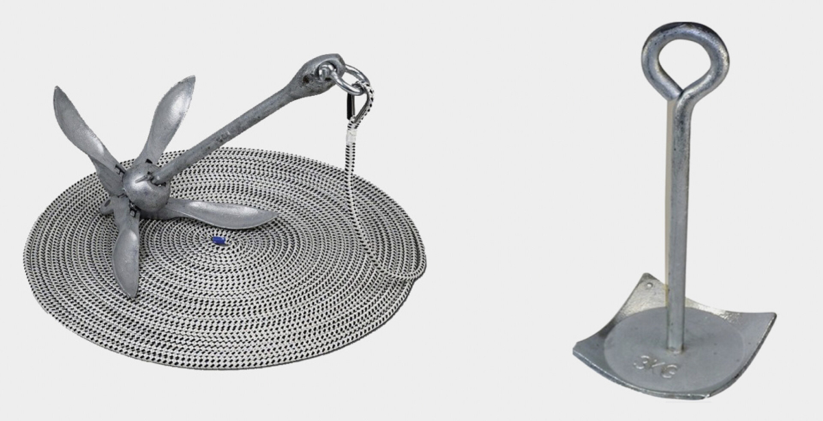 Från vänster till höger; Traditionellt Grapnel- och tallriksankare.