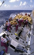 När jag var off watch brukade jag klättra ur min varm koj för att fotografera om jag hörde att det pratades om segelbyte. Jag ville fånga hur mycket ansträngning och energi det tog att brotta ner seglet och sen släpa det tillbaka. Jag märkte att om man stod på bommen vid masten, tittandes ner, så kunde man fånga hur utsatt varje besättningsmedlem var, och hur stökigt det var.