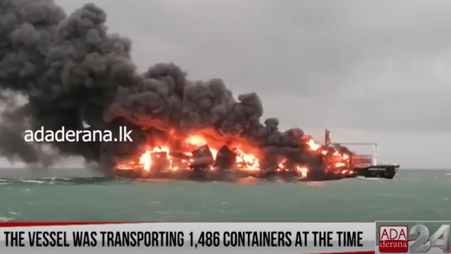 Ett containerfartyg med bland annat kemikalier ombord har stått brand utanför Sri Lankas kust i över sex dagar. Det Singapore-flaggade fartyget var lastat med 1486 containrar, inklusive 25 ton salpetersyra, när branden uppstod den 18 maj. Nedan rapporterar den lankesiska nyhetsbyrån Ada Derana.