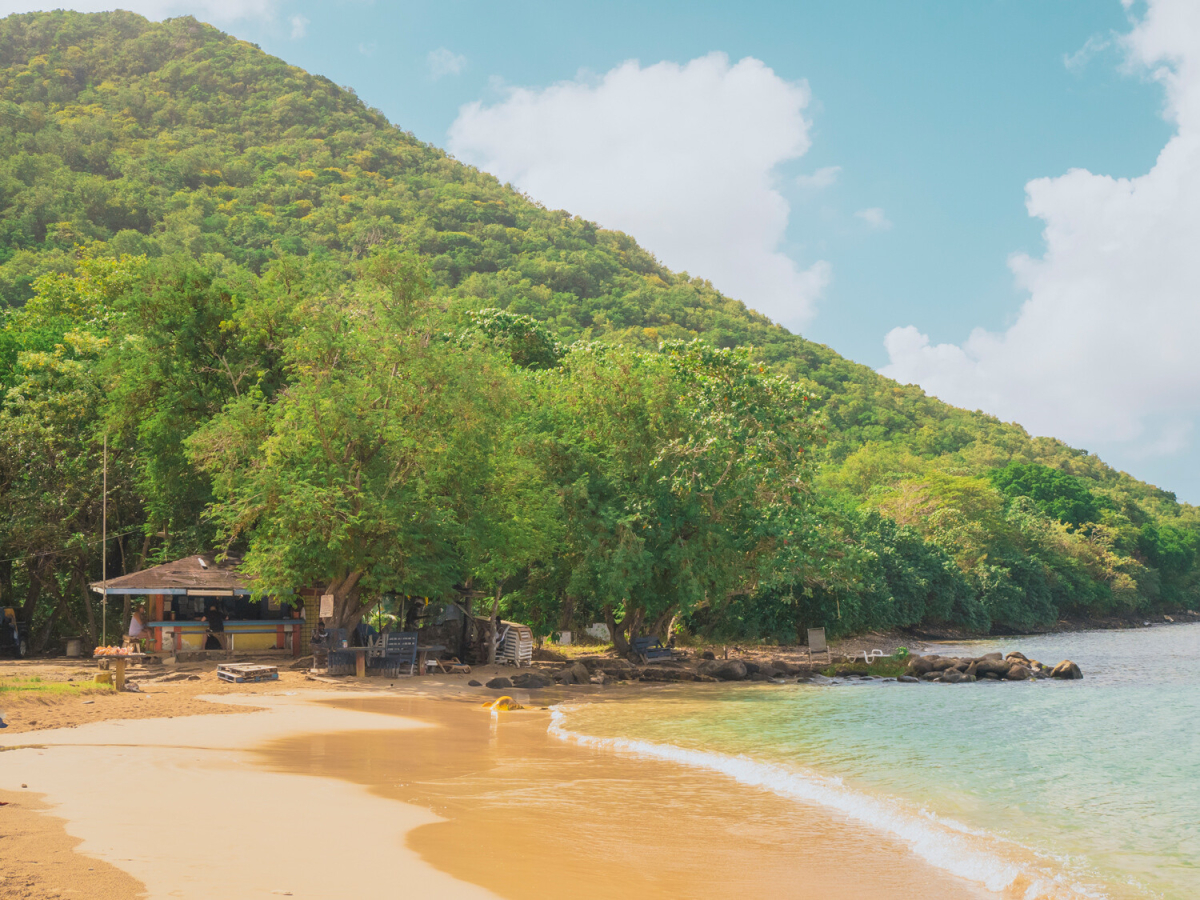 Till synes ett litet skjul längst bort på stranden, undangömt bland träden ligger Marie's Fish Shack. Foto: Madeleine Lithvall