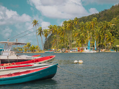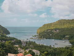 Ankra i inloppet till den lilla tropiska Marigot Bay. Foto: Madeleine Lithvall