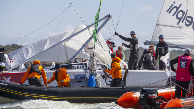 Herrarna avslutade sin grundomgång, en så kallad round robin där de två högst rankade lagen; amerikanska Chris Poole och danska Jeppe Borsch, hamnade i en dramatisk närkontakt i pre-starten, vilken resulterade i ett förödande mastbrott på den amerikanska båten. Domarna dömde att Chris Poole hade brutit mot reglerna i situationen och fick minuspoäng på grund av skadan.
