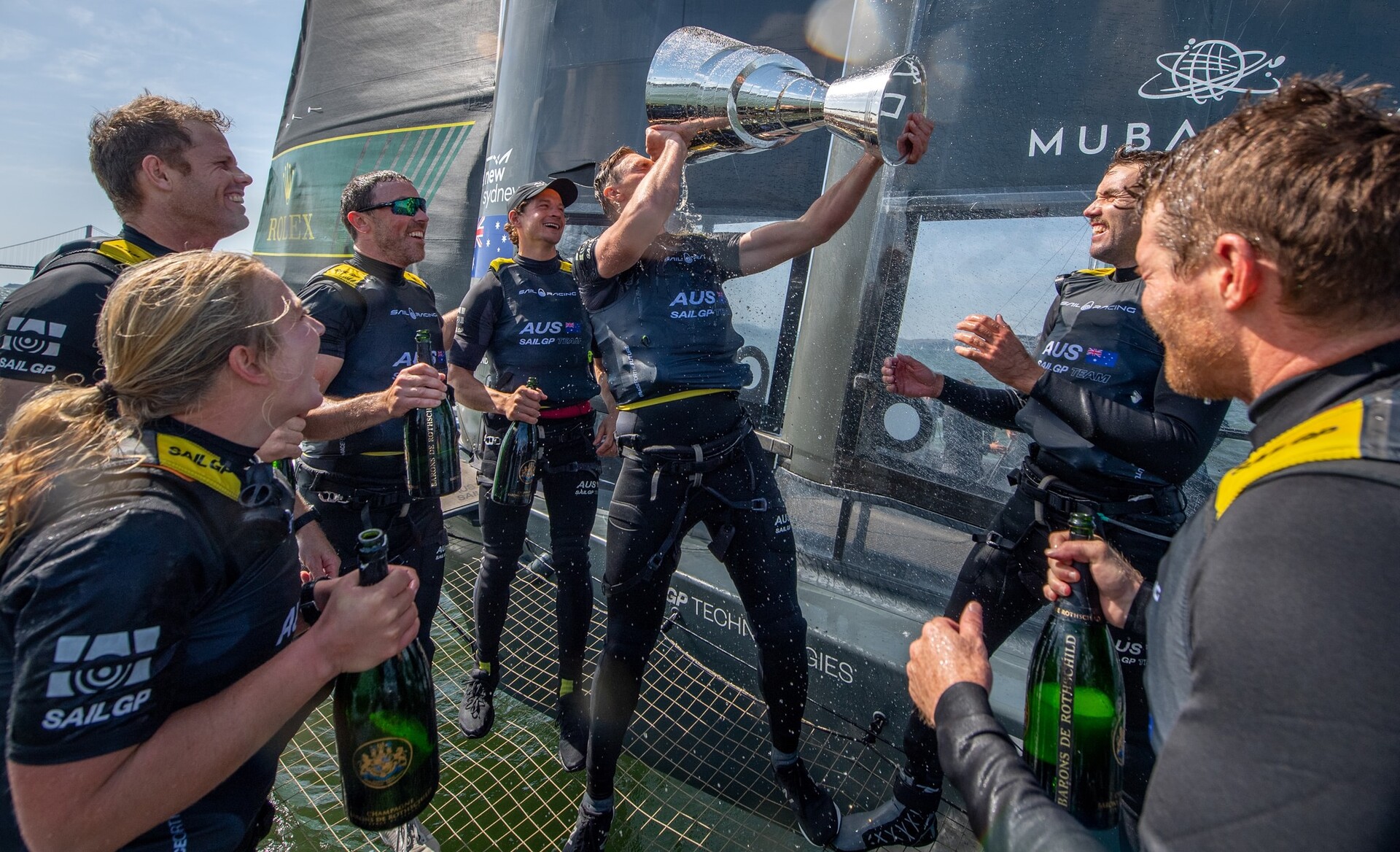 Göteborgaren Kyle Langford smakar på Champagnen när Australien firar segern. Foto: SailGP
