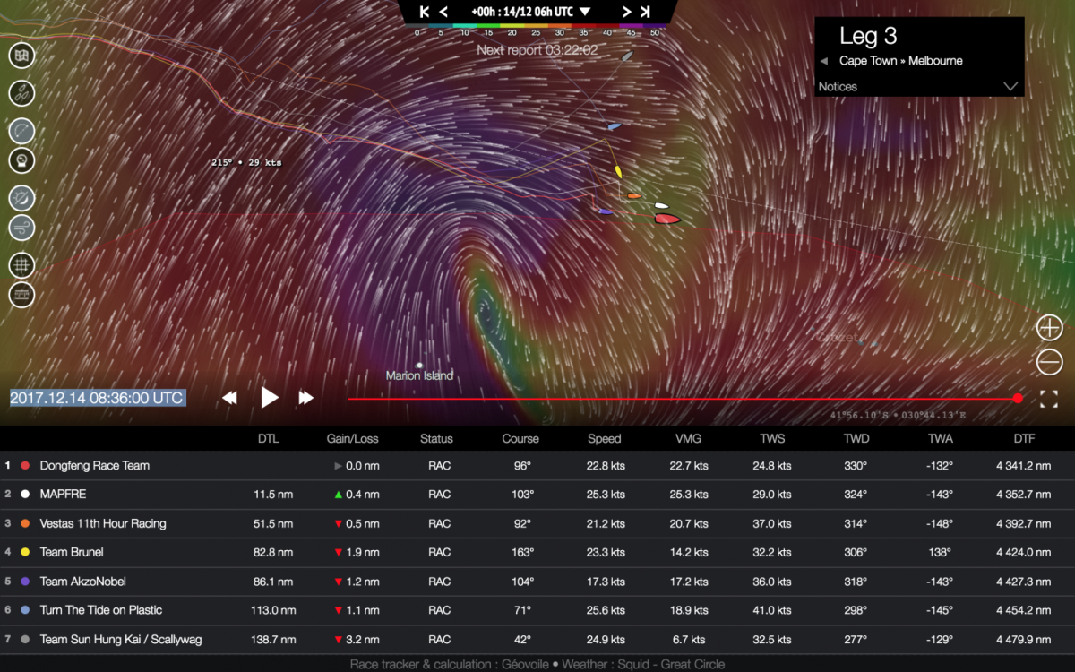 Det börjar blåsa upp rejält där nere i Södra Ishavet nu. De båtar som har hållt sig söderut har tjänat hittils och det ser ut som det kommer få ett stort tryck snart. Men kanske kan Scallywag och Turn the Tide hitta något längre norrut. Båtarna beräknas gå i mål runt 28e december och nästa etapp startar redan den 2a januari, så det gäller att inte ta för stora risker för då riskerar man att missa starten av nästa etapp.