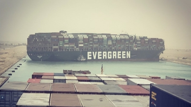 Containerfartyget Ever Given har kört på grund i Suezkanalen. Inga andra fartyg kan passera och det har nu uppstått långa köer både upp- och nedströms Ever Given. Lotsbåtar är på plats för att försöka att få loss fartyget.