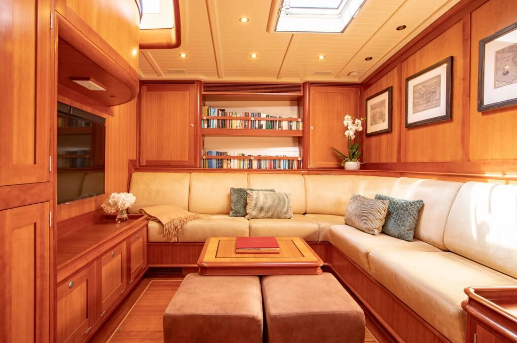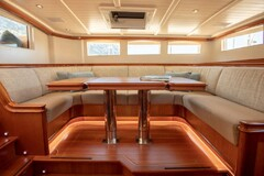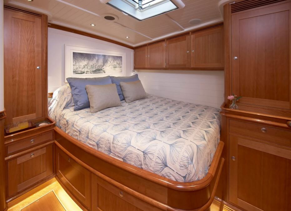 Utöver de dubbla sittbrunnarna och överbyggnaderna har denna djupgående familjecruiser besättningsboende i fören. Interiören är en av de mest voluminösa som Hoek Design någonsin ritat i ett så pass klassiskt skrov och rymmer lätt hela familjen och all packning. Den rymliga ägarsviten hittar du längst bak, men skulle du tröttna på din partner kan du gömma dig i motorummet som har full ståhöjd. Slappa i de mjuka sofforna i någon av de två salongerna - vi rekomenderar den nedre för filmkvällen, panoramafönstren i den övre salongen släpper in alldendes för mycket ljus. Det stora köket har en öppen planlösning och är betydligt större än de kök man hittar i de flesta stockholmslägenheter.