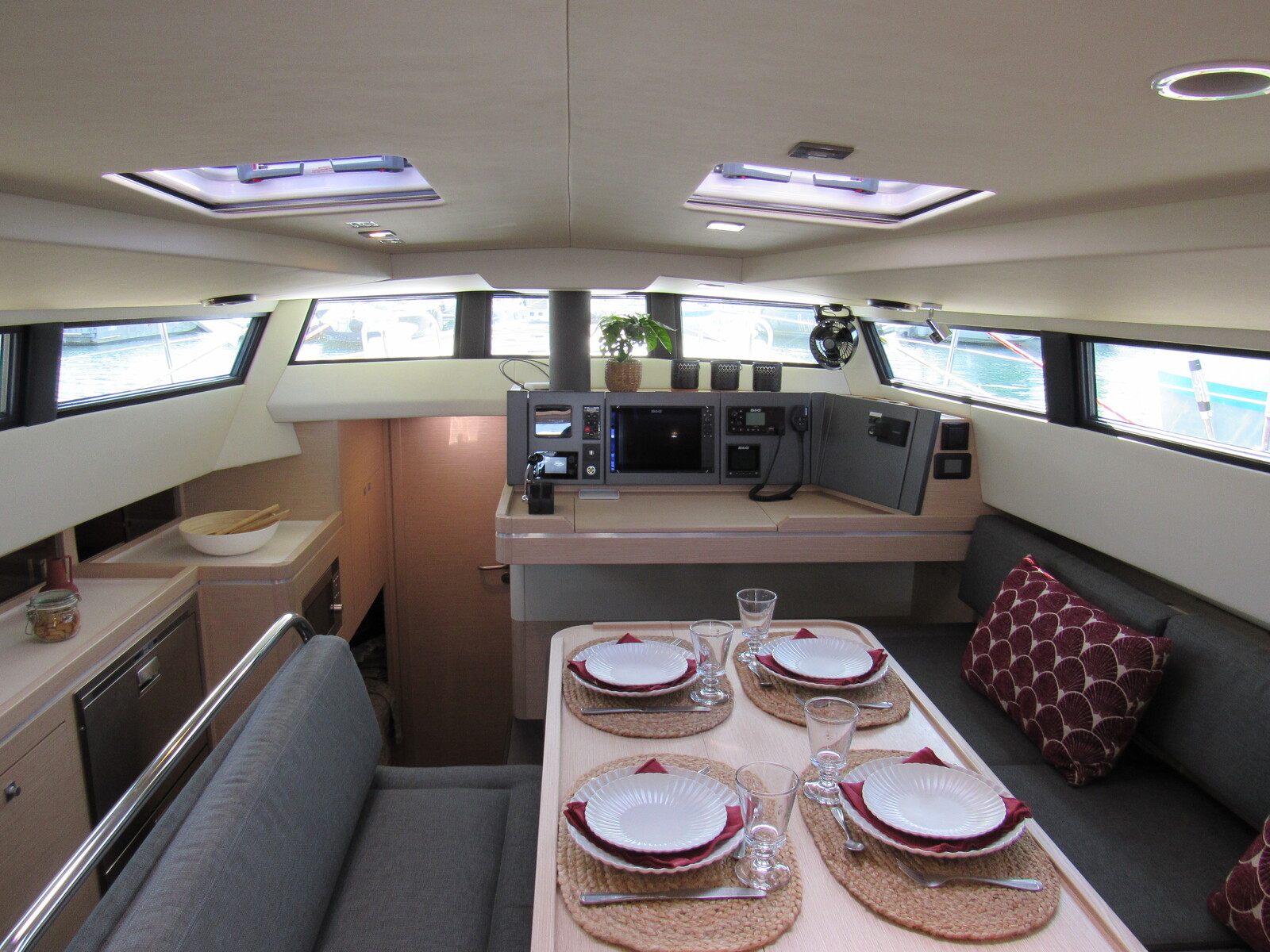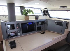 Man går inte ”ner” i salongen utan ”in”. Trots den oslagbara utsikten på 270 grader (något de flesta drömmer om att kunna skryta med) är den stora behållningen navigeringsstationen. Vi föreställer oss att det är här man smider planerna inför nästa rutt. Instrumentpanelen är rejäl, liksom bordsytan och man sitter bekvämt i en framåtvänd stol med bänk. Sikten är oklanderlig och med samtliga kommunikationsenheter, MFD och gasreglage på en armlängdsavstånd i kombination med fjärrkontrollen till autopiloten är båten praktiskt taget segelbar från insidan.