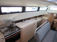 Det avlånga pentryt ligger på babord sida och erbjuder stora arbetsytor för kocken. Här finns två frysar, lådor, skåp, en diskbänk med dubbelho och praktiska stödpunkter när båten kränger. Ett sällskap på sex sitter bekvämt och äter vid bordet. Går man förut och ner ligger det en väldigt låg sjökoj på babord sida, med extra skåp till förvaring ovanför.