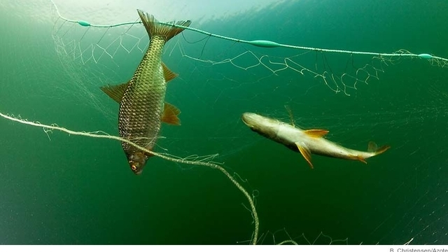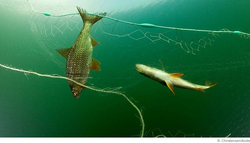 Gamla fiskelinor, nät och trålar. Totalt står borttappad eller dumpad fiskeutrustning, så kallade spökgarn, för 10% av allt plastskräp i haven. Moderna fiskeredskap är tillverkade av svårnedbrytbara konstfibermaterial och fortsätter att fånga och skada marint djurliv år efter år. Det är inte bara fisk som skadas av spökgarnen, även fåglar och andra marina djur fastnar och dör genom kvävning eller svält.