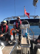 Efter lunch bjöds det på action! Plötsligt ropar Deniz “Man över bord “ och kastar i en fender som elverna ska fiska upp ur plurret. Att rädda en fender är visserligen inte Inte lika dramatiskt som när man skulle rädda Johan Tuvstedt mitt under pågående Sydney Hobart, men övningen är minst lika viktig. Några av deltagarna på kursen har det lite bökigt och Deniz får komma med lite handfasta och kloka råd, men Marcus och Christian lyckas framgångsrikt leda besättningsarbetet och får upp fendern på första försöket.