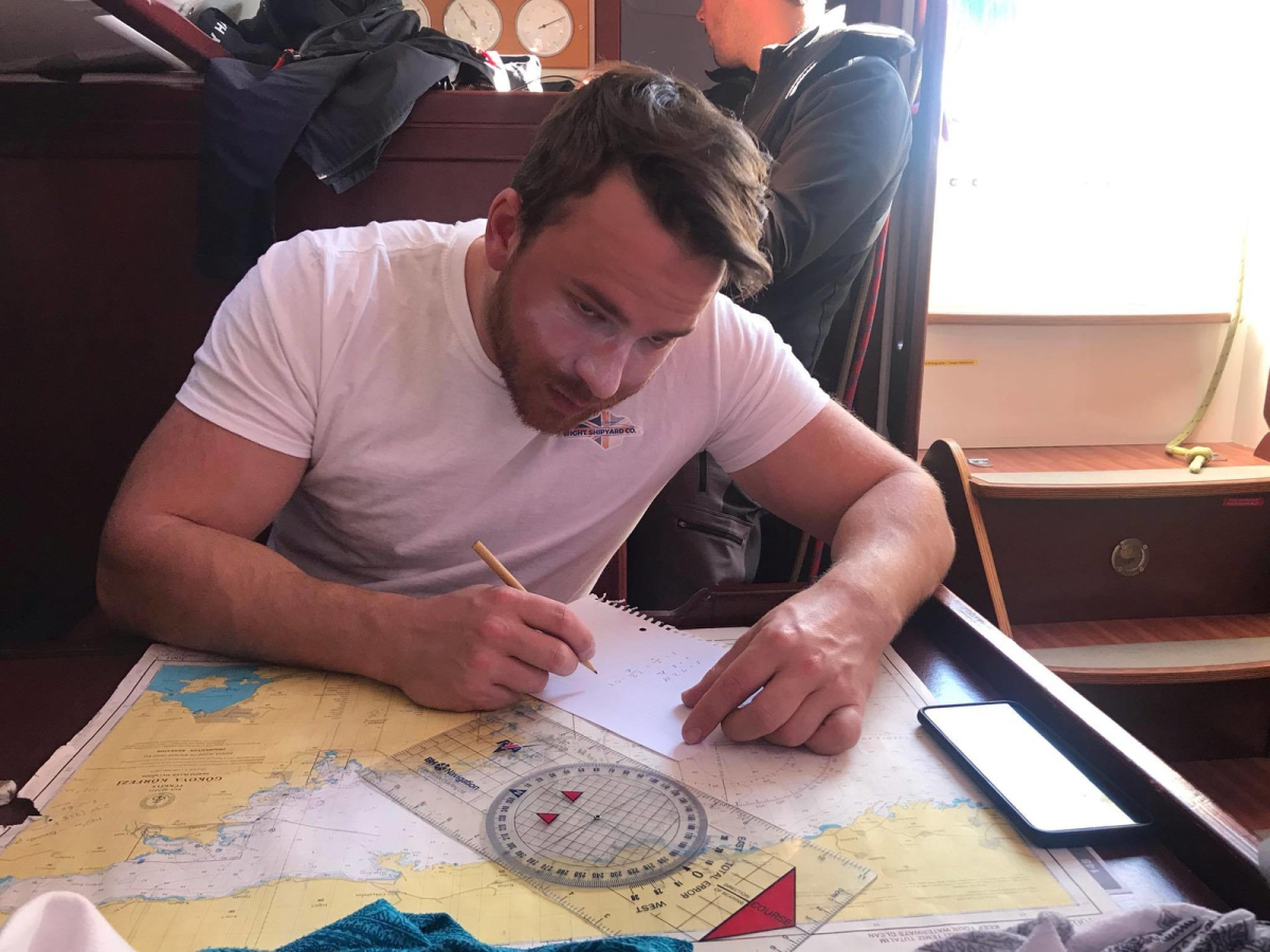 Efter en tuff dag på sjön käkar man middag på båten innan det blir dags att plocka fram pappersjökorten för gamla hederliga räkneövningar på deviation, tidvatten och ström. Om pojkarna kunder briljera vid segelsättning och livräddning har de det svettigare nu, men kvällen avslutas detta till trots vid gott mod - dags för nya tag imorgon!
