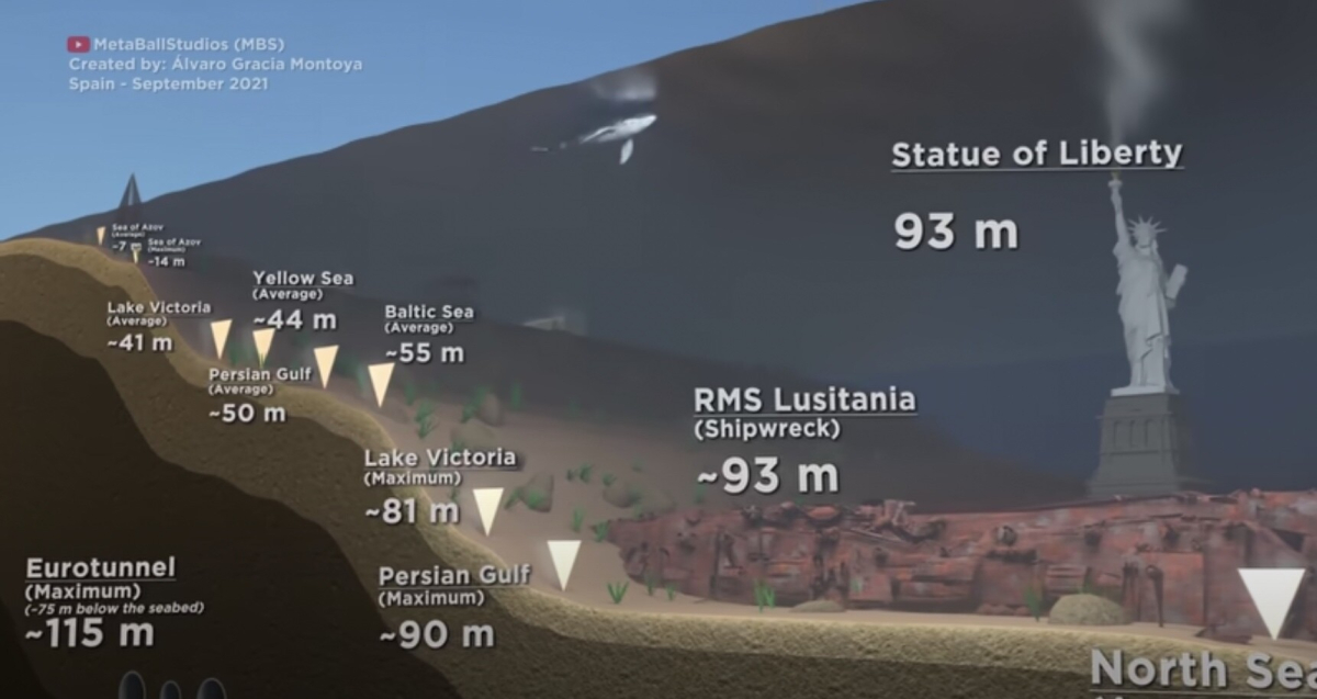 Över 70 procent av jordklotets yta täcks av hav. Trots det sägs det att vet vi mer om rymden än av vad som händer under ytan. Klippet nedan är en tredimensionell animering av djupet för olika sjöar och hav, från landbacken till Marianergraven i västra Stilla havet som är ett av världens största djup.