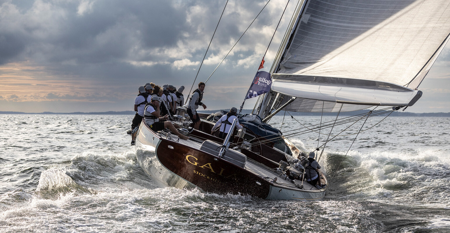 Underbart vackra Gaia som seglar i klassen "Spirit of Tradition" var den första av Gotland Runt-båtarna som kom till Sandhamn. Efter 30:19:45 kom hon forsande i mål på en brant halvvind. Foto: Henrik Trygg