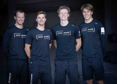 Raceeamet (youth), från vänster; Rasmus Alnebeck, Oscar Engström, Ludvig Lindqvist, Hugo Christensson. Redo att kliva ombord står Felicia Fernström, som också är del av Swedish Challenge Women’s Team, samt Hanno Seifert och Oscar Andersson. Foto: Swedish Challenge