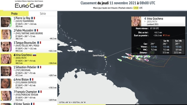 Mini Transat 2021 är inte långt ifrån avgörande. Ledarbåten Teamwork med Pierre Leroy vid rodret befinner sig just nu lite drygt 280M från målgången utanför Saint-François på Guadeloupe. Irina Gracheva, med coach Mikael Ryking, ligger för närvarande på fjörde plats med 468M kvar till mål.