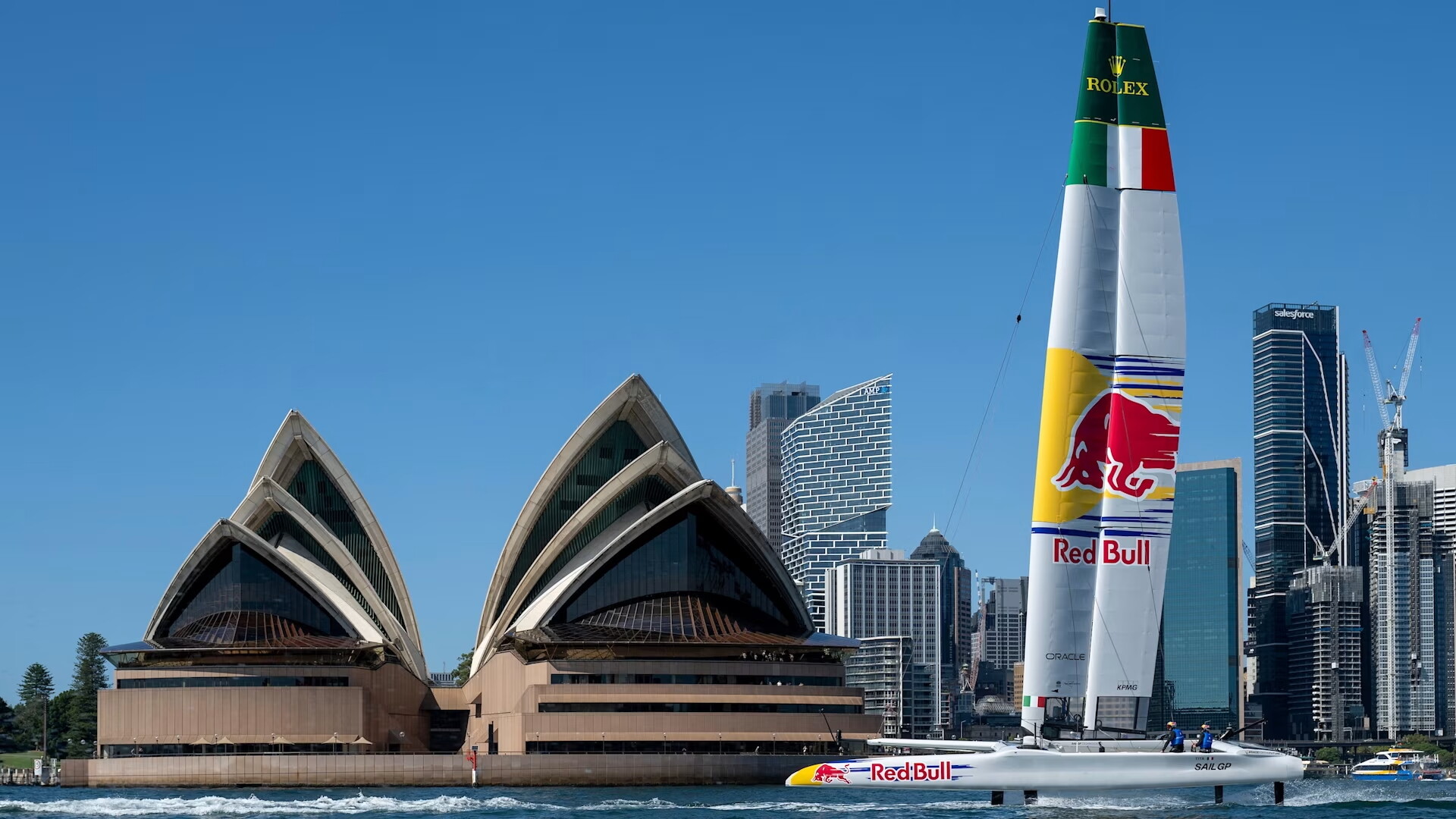 Red Bull Italy SailGP Team framför operahuset i Sydney. Foto: SailGP