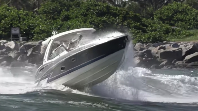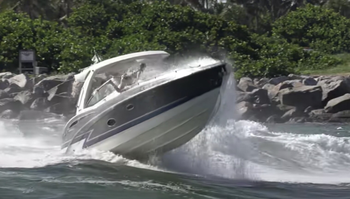 Det är ingen hemlighet att Haulover Inlet ibland bjuder på stökiga förhållanden. Här råkar en solbadare på fördäck illa ut men som tur är plockas hon snabbt upp av en uppmärksam Jet-Ski-förare.