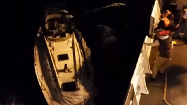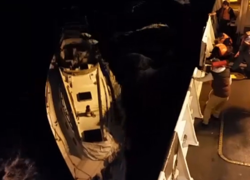 Den olycksalige seglaren spenderade därefter 5 dagar drivandes då han fokuserade på hålla båten flytande. Flera fartyg ignorerade hans nödanrop, men till slut fick han kontakt med det amerikanska forskningsfartyget. Detta i samband med att han var på väg att överge sin sjunkande båt och gå i livflotten. När han skulle undsättas blåste det runt 20 m/s och våghöjden låg på 5 meter. Som vi kan se i klippet nedan var det inte helt lätt att ta sig ombord på forskningsfartyget när de väl lokaliserat honom... Enligt tidningsartikeln skall han efter tre timmar slutligen ha kommit ombord, och då fått ansluta till besättningens julfest där kaptenen var tomte... Utöver räddningen skall han också ha fått en T-shirt i julklapp...