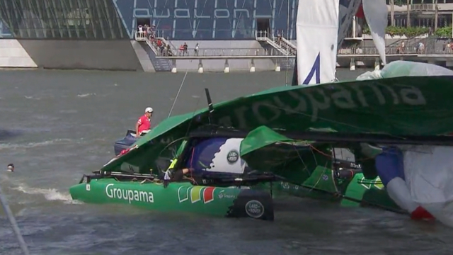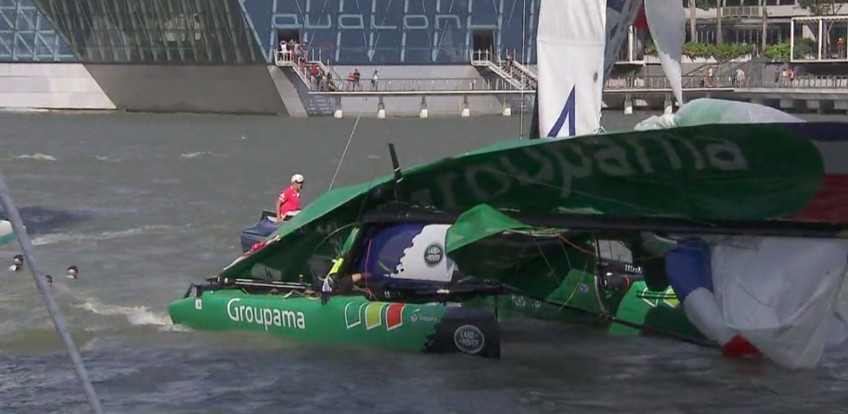 Händelsen var på Extreme Sailing Series i Singapore 2014 och lyckligtvis blev ingen allvarligt skadad. Kraschen är obehaglig att kolla på då flera besättningsmedlemmar är under Aberdeens skrov och försöker krypa ut för att inte göra illa sig. Det är minst sagt en extrem serie när båtarna till och med segla upp på varandra.