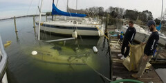 Att bärga en sjunken båt är inte en lätt uppgift. I det här fallet ligger dock båten hyfsat grunt och på behändigt avstånd från bryggan.