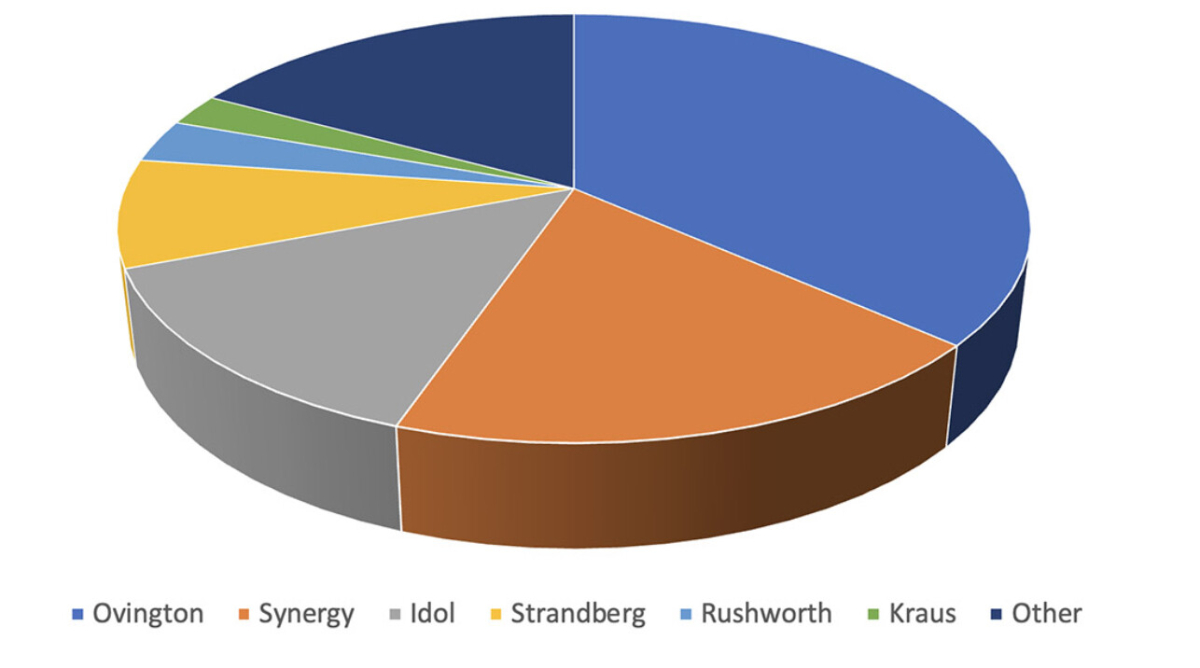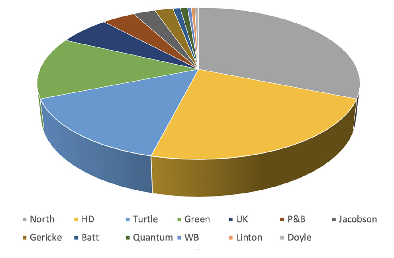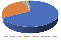 Diagrammen nedan visar cirka 90 procent av den utrustningen som användes vid världsmästerskapet. Brittiska skrov och segel dominerade vilket var väntat men master och bommar var mer spridda geografiskt. Totalt deltog 24 båtbyggare och 13 segelmakare. Inga av dessa utmärkte sig som the one and only. Topp fyraseglade olika båtar och sex olika segelmakare var representerade inom topp 10.