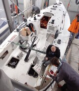 Däcket har fått sig en rejäl uppfräschning. Tidigare har det haft ett antislipmönster, ett ruttnät av små knottror som naturligt har slitits med åren. När skador lagats och lister tagits bort, passade laget på att uppdatera greppet till foam och kiwi-grip. "Vi har tidigare haft foam i sittbrunnen, men nu tar vi upp det på däck och fördäck med. Det kommer att bli bekvämt att sitta på railen." Genom åren har det vuxit fram ett spindelnät av "lösningar" på Patriks rufftak. Varje seglare har fått göra sina anpassningar och resultatet har blivit en av de mest komplicerade knyppeldynorna i båthistorien. Förutom att den behövde riggas av och sedan riggas upp, vilket kommer att bli en utmaning för laget, har den även gått igenom och finslipats. Längre akterut kommer en ny lösning på akterstaget som tar bort behovet av vinsch.