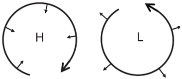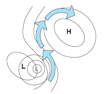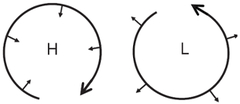Fig1. När corioliseffekten söker avlänka vinden åt höger (små pilar) har det för medurs högtrycksströmning konsekvensen att "hålla ihop" högtrycket till skillnad från cirkulationen runt ett lågtryck.