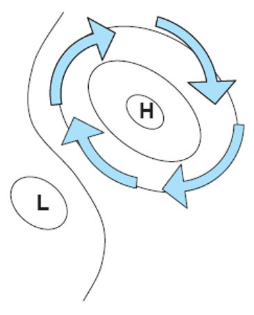 Ett högtryck är ett slags ”luftberg” där luften snurrar medurs. Både tryckgradientkraften och centrifugalkraften pekar utåt och skulle snart ha fått luften i detta ”berg” att flyta ut åt alla sidor.