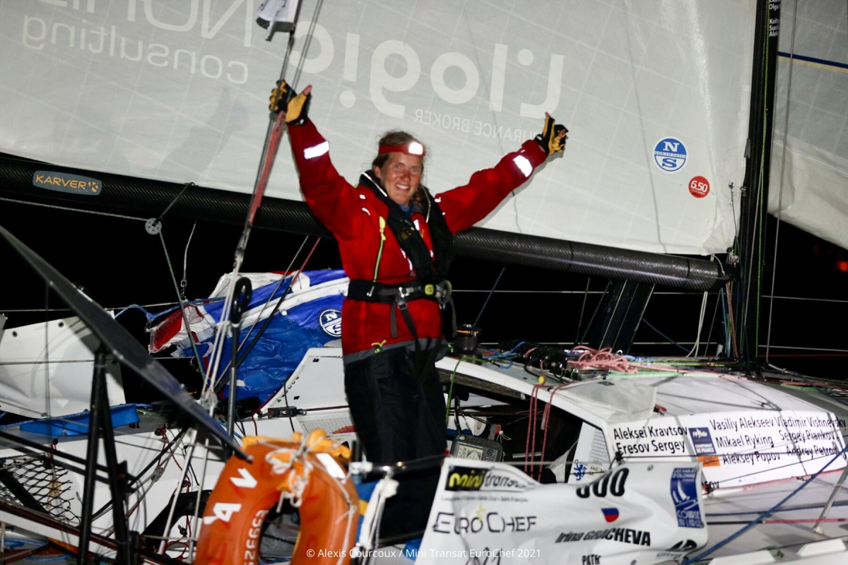 Första etappen av Mini Transat EuroChef är avgjord, i alla fall topp fyra. Upp på pallen seglade Tanguy Bouroullec, Fabio Muzzolini och Pierre Le Roy. På fjärde plats slutade Irina Gracheva som coachas av Mikael Ryking. Hon skar mållinjen utanför Santa Cruz de La Palma klockan 03:22 (UTC+ 2) i natt efter 7 dagar, 11 timmar och 44 sekunder på banan samt 1350 seglade sjömil.