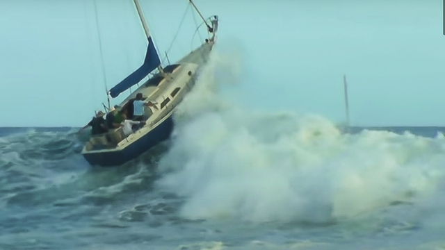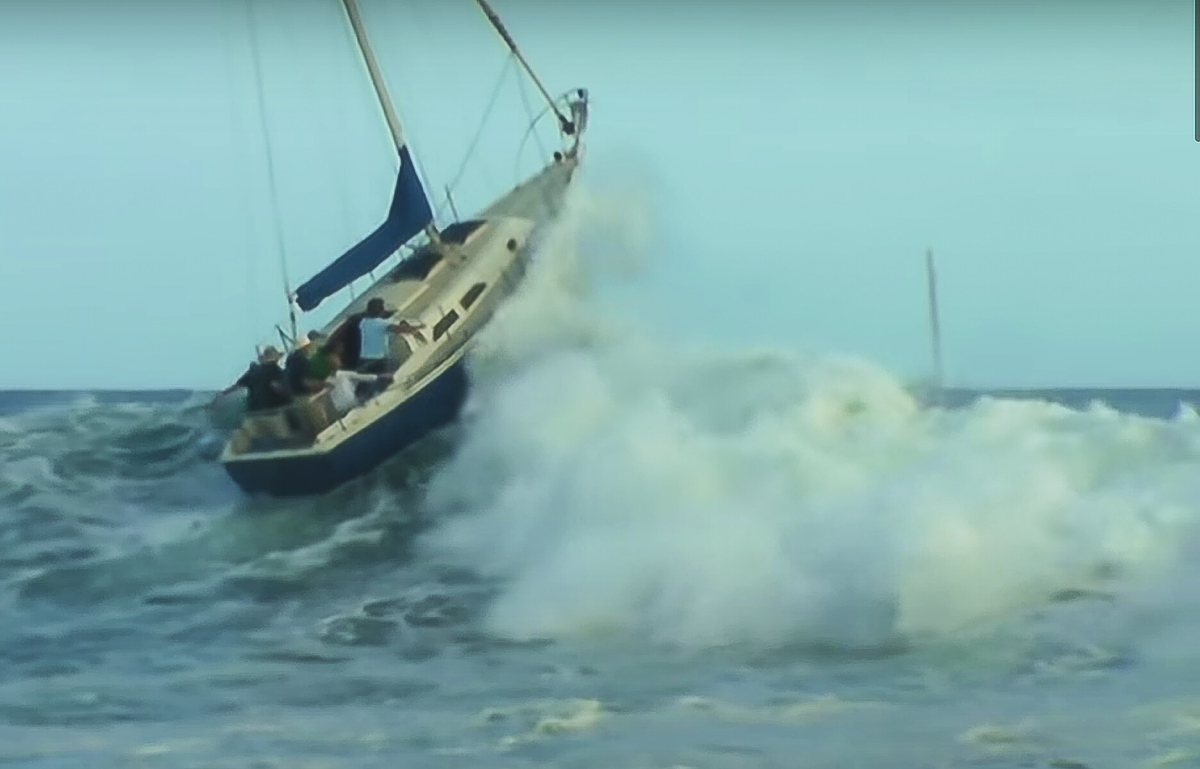 Varför den här besättningen bestämt sig för att ge sig ut i surfet med båt vet vi inte, men det ser aningen riskabelt ut.