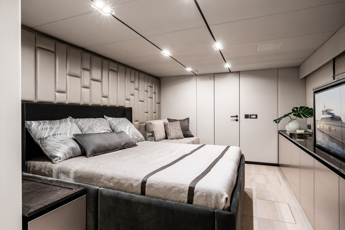 Båten har fyra hytter varav ägarhytten är utrustad med walk in closet, soffa och TV samt utfällbar balkong. En trevlig detalj är att man kan cabba ner, eller blir det kanske upp, när lusten faller in. Här har man uppenbarligen fångat in friluftstrenden att sova under bar himmel. Nyfiken på fler detaljer? Kolla in klippet nedan!