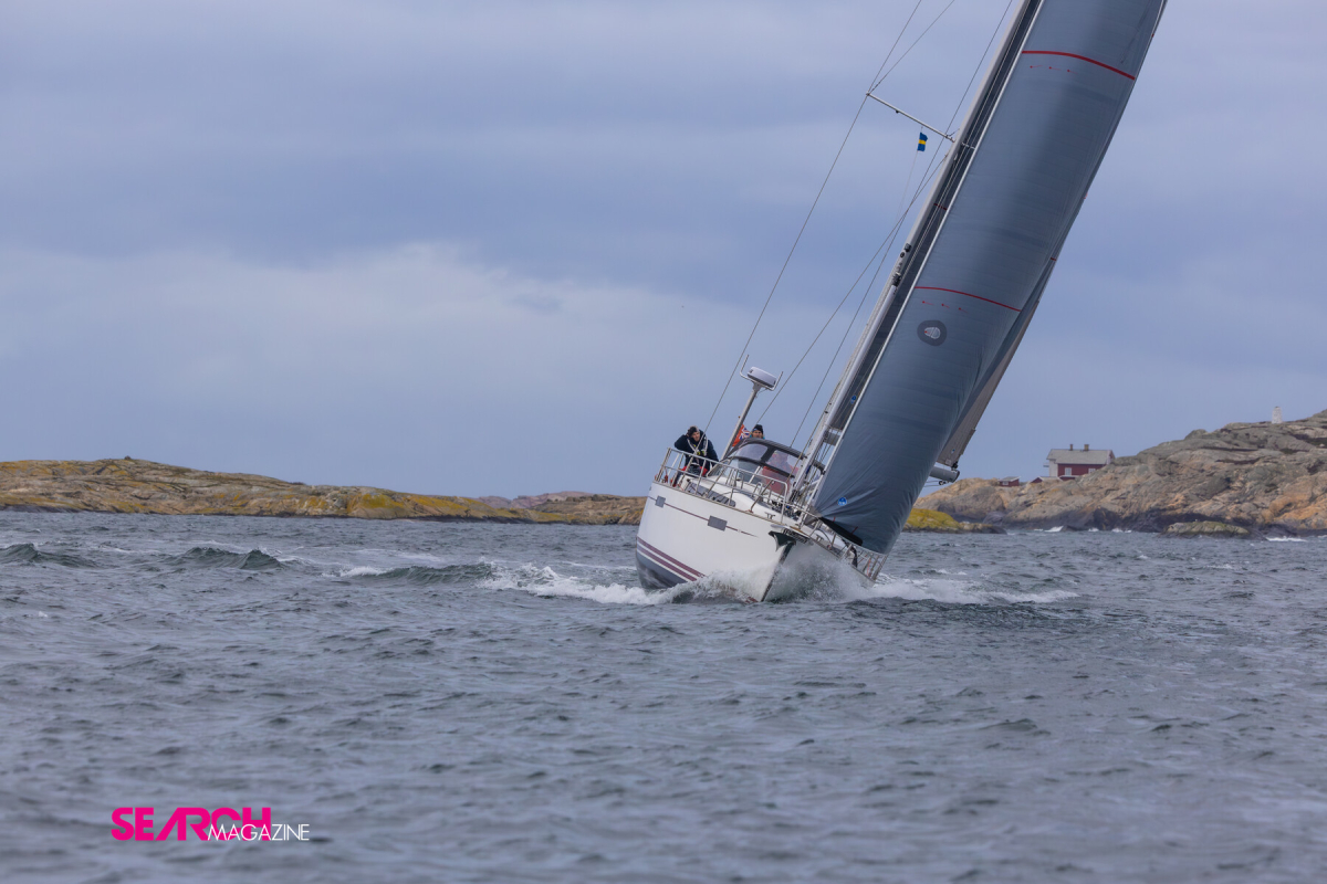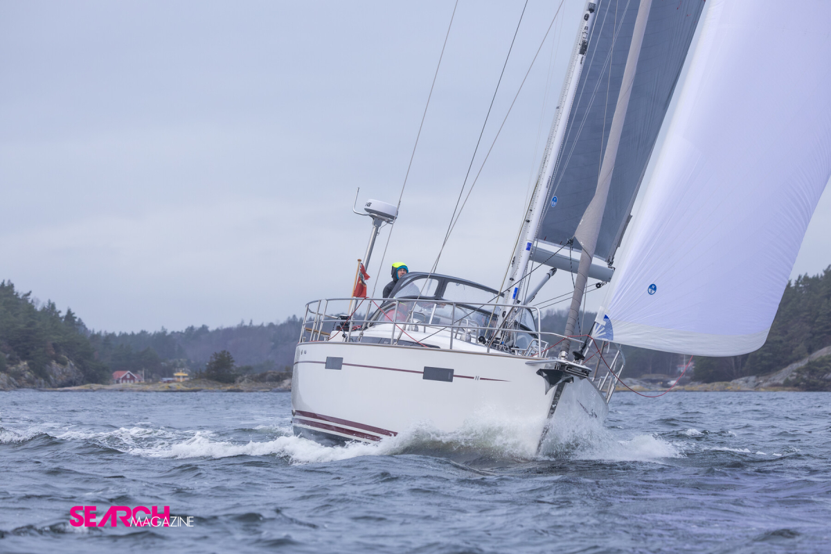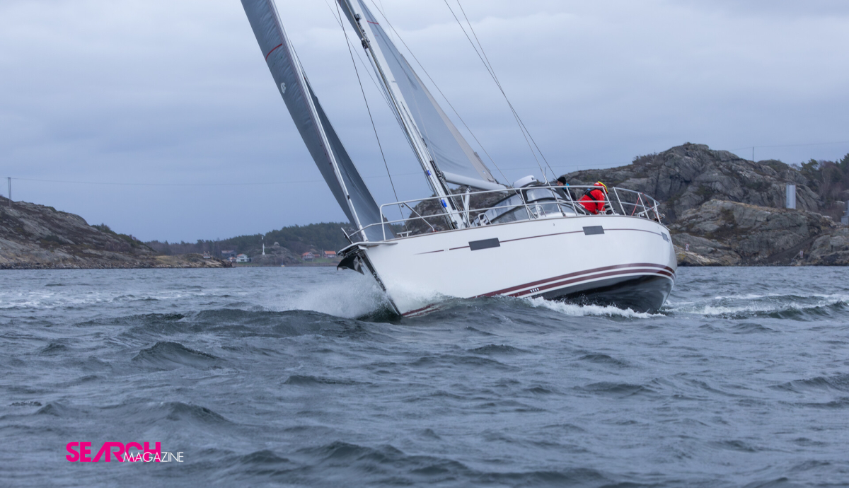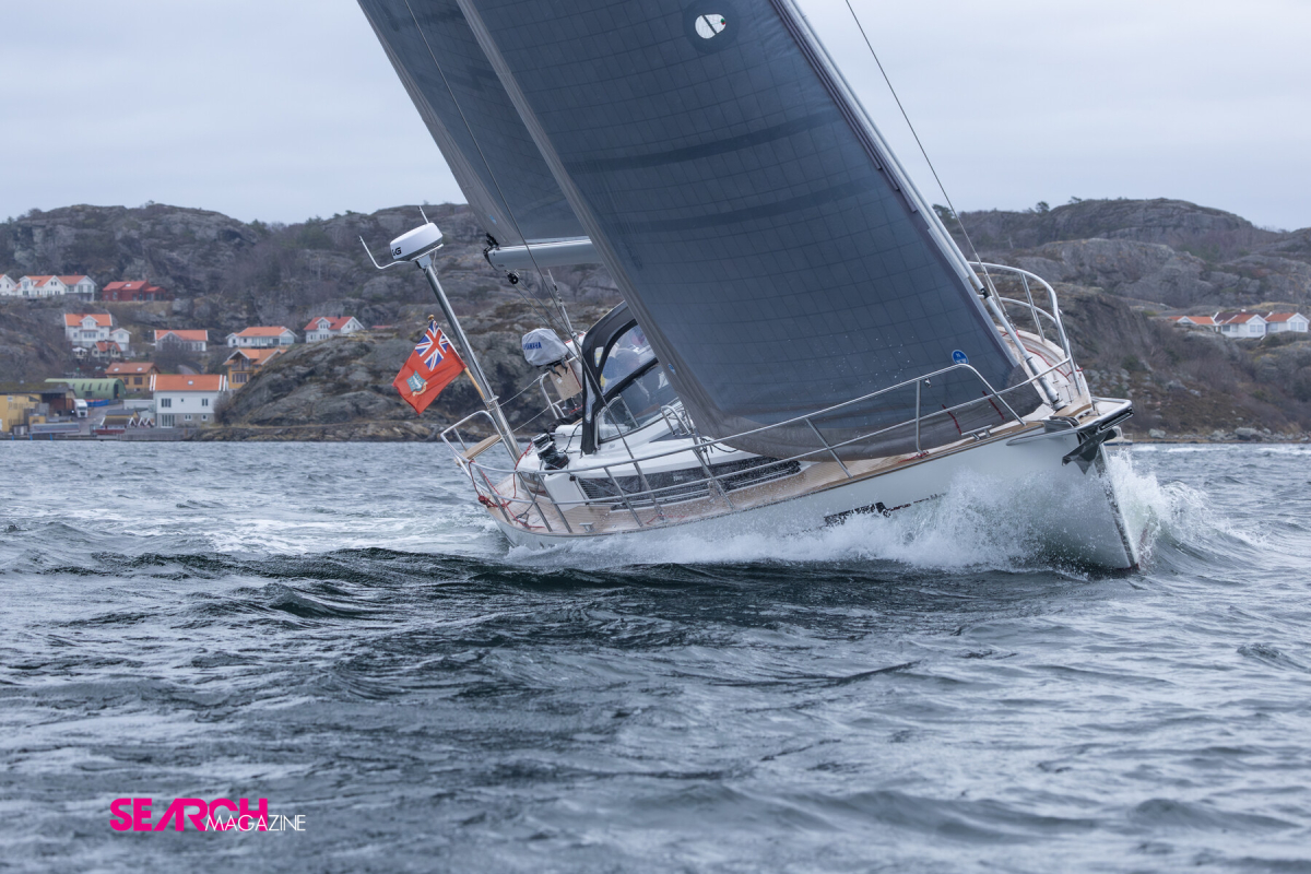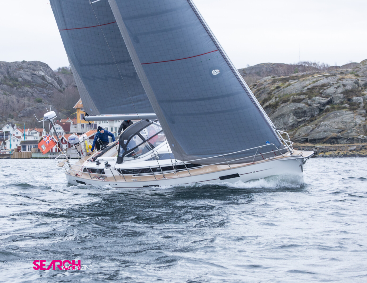 Testet inleds med motorgång genom skärgården, från Ellös ut mot öppnare vatten. Känslan är harmonisk, motorn hörs knappt. Vi hissar segel och ger oss ut mot öppet hav. ”Trots hård vind och grov sjö ger sittbrunnen ett gott skydd mot elementen. Vi gör anständiga sju knop på kryssen med ett rev i både storsegel och fock. Vi ser ingen anledning att jaga minsta by eller vindskift. Båten är tung och går igenom det mesta. På undanvinden seglar vi med endast stor och fock. Vi gör 11 knop i surfen vilket känns extremt för en stor cruiser som den här.”