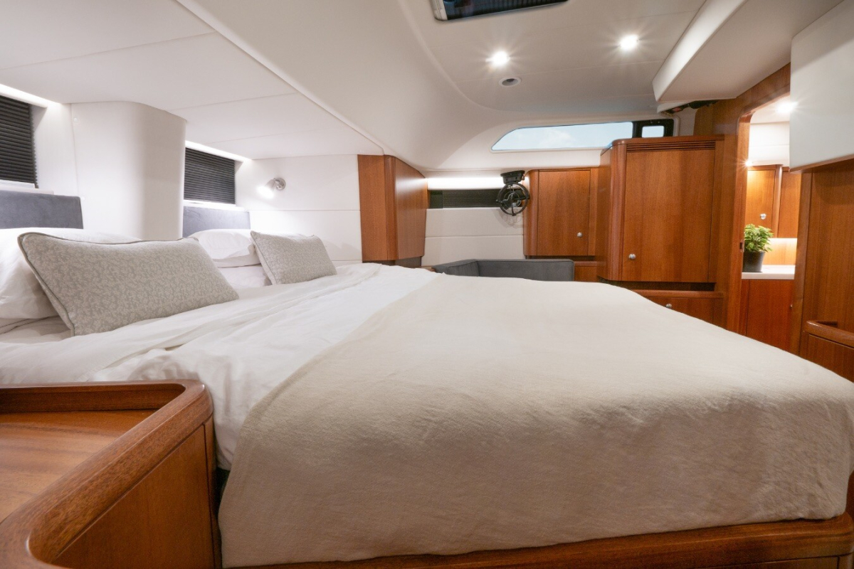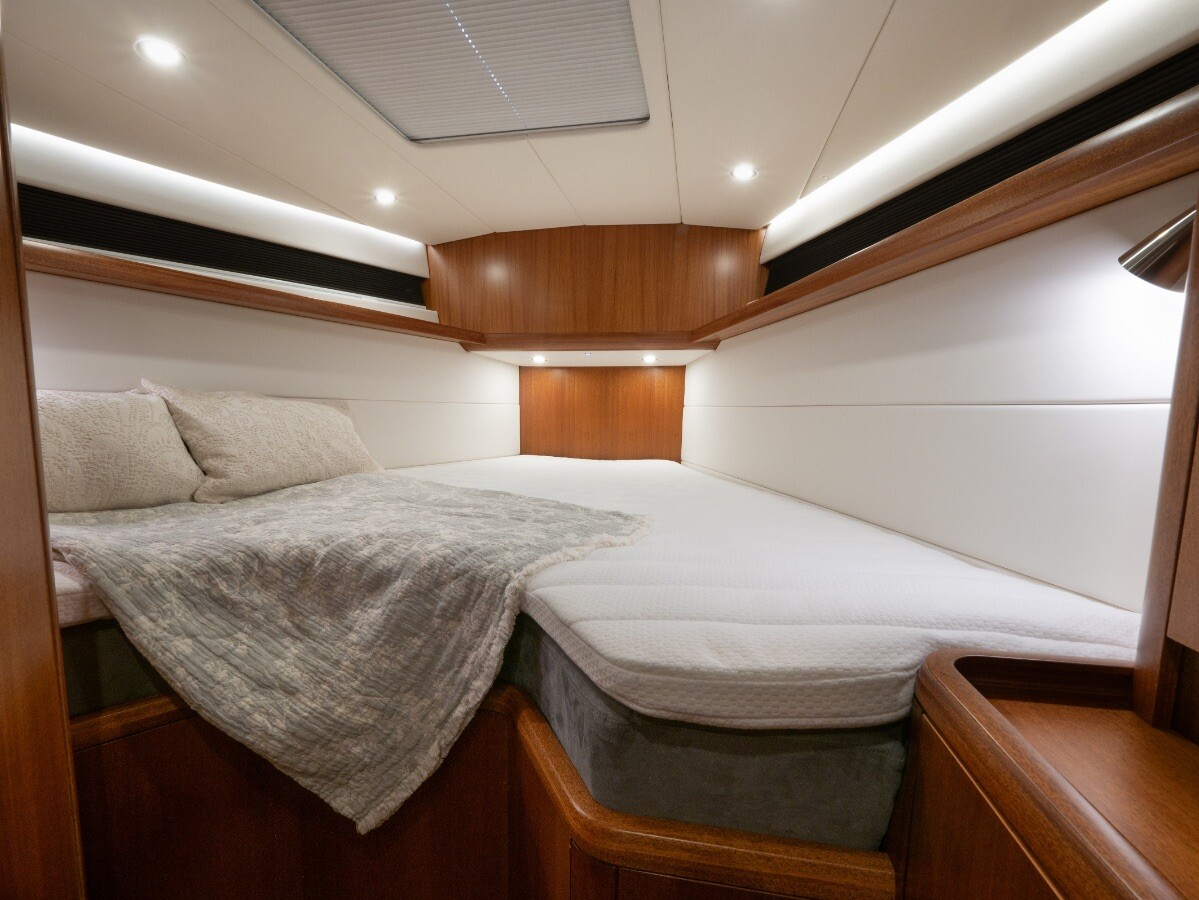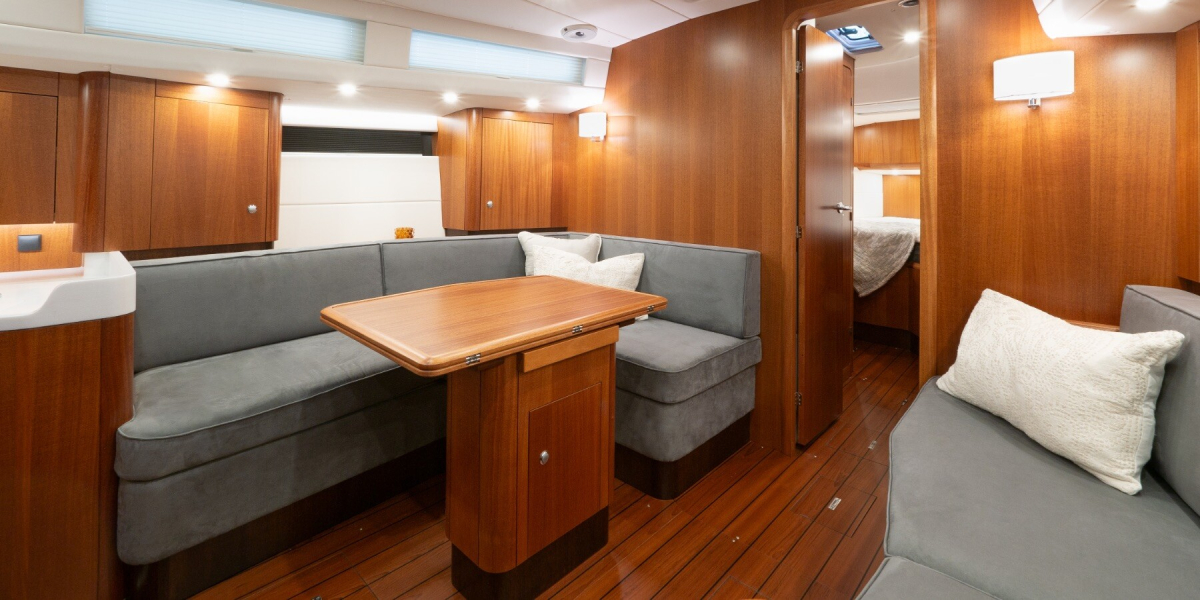 Det första vi möts av är en stor och ljus salong. Direkt till babord ligger det välutrustade pentryt med skåp, hyllor, bänkar, två kylskåp, en frys och dubbelho samt elektrisk spis med ugn. Navigeringsstationen ligger mitt emot. Instrumenteringen manövreras via en snygg touchscreen från CZone med manuella säkringar bakom som backup. Salongsbordet, som ger gott om plats för avslappnat umgänge, går att vika ut till ett stort matsalsbord när det kommer gäster på besök.