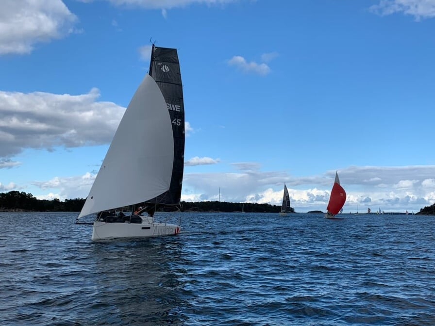 Därifrån in till mål var det lite djup slör. Vi kände oss hotade av Team Mobline. Vi gick inte fort nog så vi satte genuan och tog ner code 0 för att kunna sätta stora genakern men vinden ökade och vred emot så vi fick sätta coden igen och utökade försprånget mot Team Mobline igen. Vid handikappsegling är det alltid någons väder och alla seglar inte i samma vindar. Nu var det vår tur och vi lyckades även hålla båtarna som startade ungefär samtidigt bakom oss.