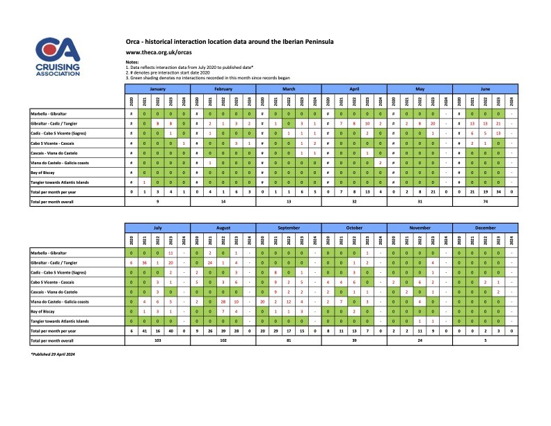 Cruising Association (CA) har analyserat tillgängliga interaktionsrapporter för späckhuggare sedan 2020. Målet är att ta fram en ny tabell som visar antalet interaktioner och attacker, per månad och år, längs med atlantkusten i Frankrike, Portugal, Spanien och genom Gibraltarsundet.