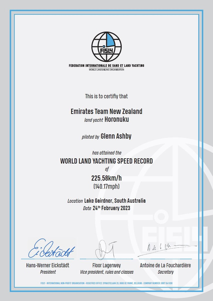 Den 11 december slog Emirates Team New Zealand världsrekord med sin vinddrivna landfarkost Horonuku med 222,4 km/h. Som avslutning på segerintervjun sa Glenn Ashby så här: ”Teamet är verkligen stolta - men vi vet att Horonuku har mer i sig. Vi hoppas kunna gå igenom samma process med en ännu högre hastighet nästa gång vädret tillåter.”