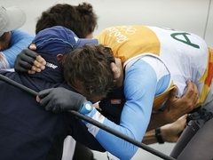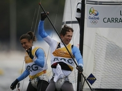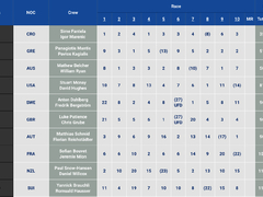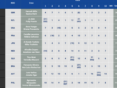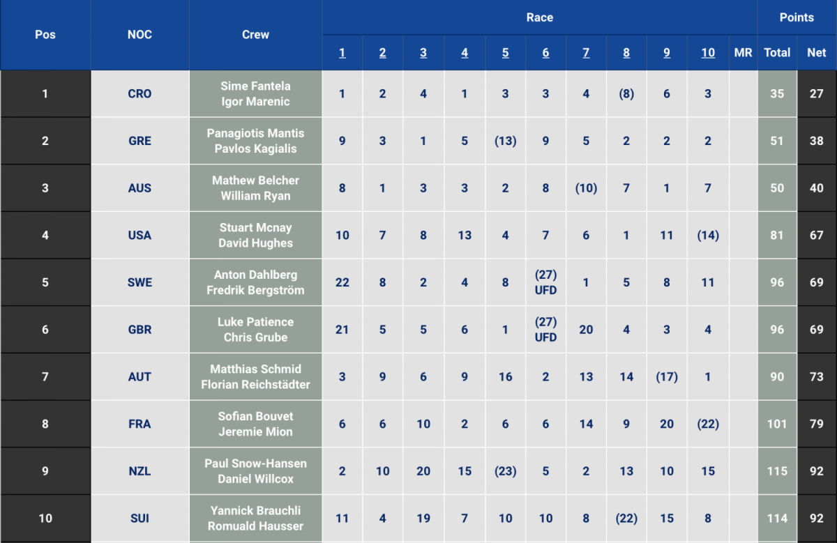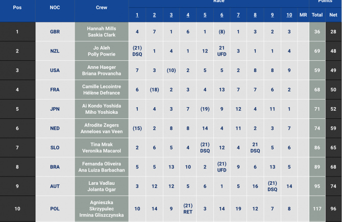 Guldet är redan säkrat av Hannah Mills och Saskia Clark(GBR) men det blir en rafflande kamp om silver och brons. NZL, USA, FRA, JPN är nästan på samma poäng och Holland och SLO jagar strax bakom. Extremt spännande!