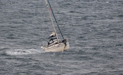 Vi befann oss mer än 50 sjömil från kusten när vårt roder gick sönder. Efter att ha skickat ett PAN-PAN-anrop på VHF-radion svarade den tremastade segelbåten Götheborg snabbt på vårt anrop och erbjöd sig att bogsera oss till Paimpol (Frankrike).