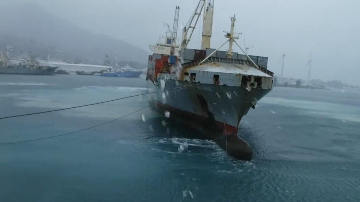 Port Victoria, Seychellerna. Autospänning på förtöjningslinorna har sina fördelar, men inte alltid. Här här det just autospänningen som orskar första missödet i en serie av händelser som så småningom leder till grundstötning för både fartyg och assisterande bogserbåt.