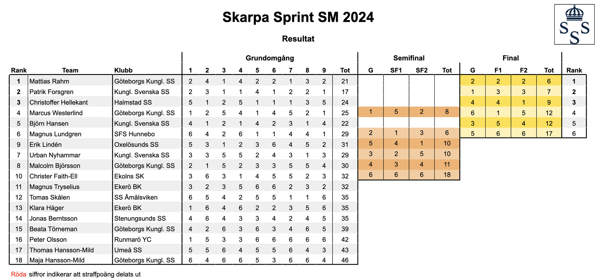 Helgen den 21-22 september avgjordes Skarpa Sprint SM i Saltsjöbaden på Baggensfjärden. Arton lag stod på startlinjen. Segrande ur leken gick Mattias Rahm (rorsman), Mikael (travare) och Daniel (fördäck) Björndahl samt Emil Wolfgang (trim) från GKSS. Med dem mycket jämna och fina finalserien (2, 2 och 2) bärgade de guldet före Patrik Forsgren (KSSS) med besättning och Christoffer Hellekant (HSS) & Co. Se fullständiga resultat längst ner.