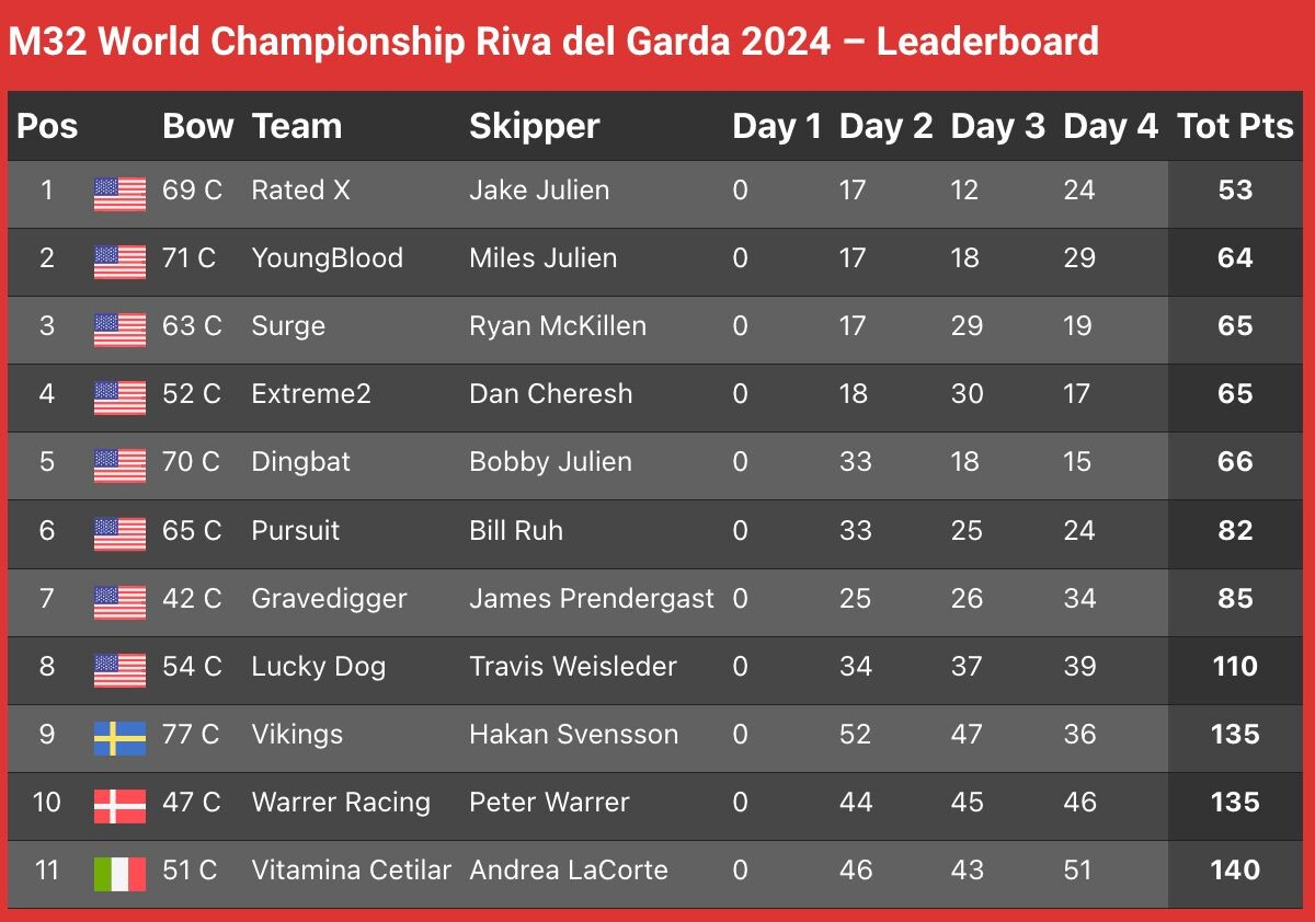 Årets världsmästerskap i M32 gick av stapeln den 2-8 september på vackra Gardasjön med Riva del Garda som bas. Rated X, med unge Jake Julien vid rodret och Julius Hallström, göteborgsbaserade Keith Swinton och Rhys Mara samt Jeff McCooey i besättningen, lyckades försvara fjolårets guld.