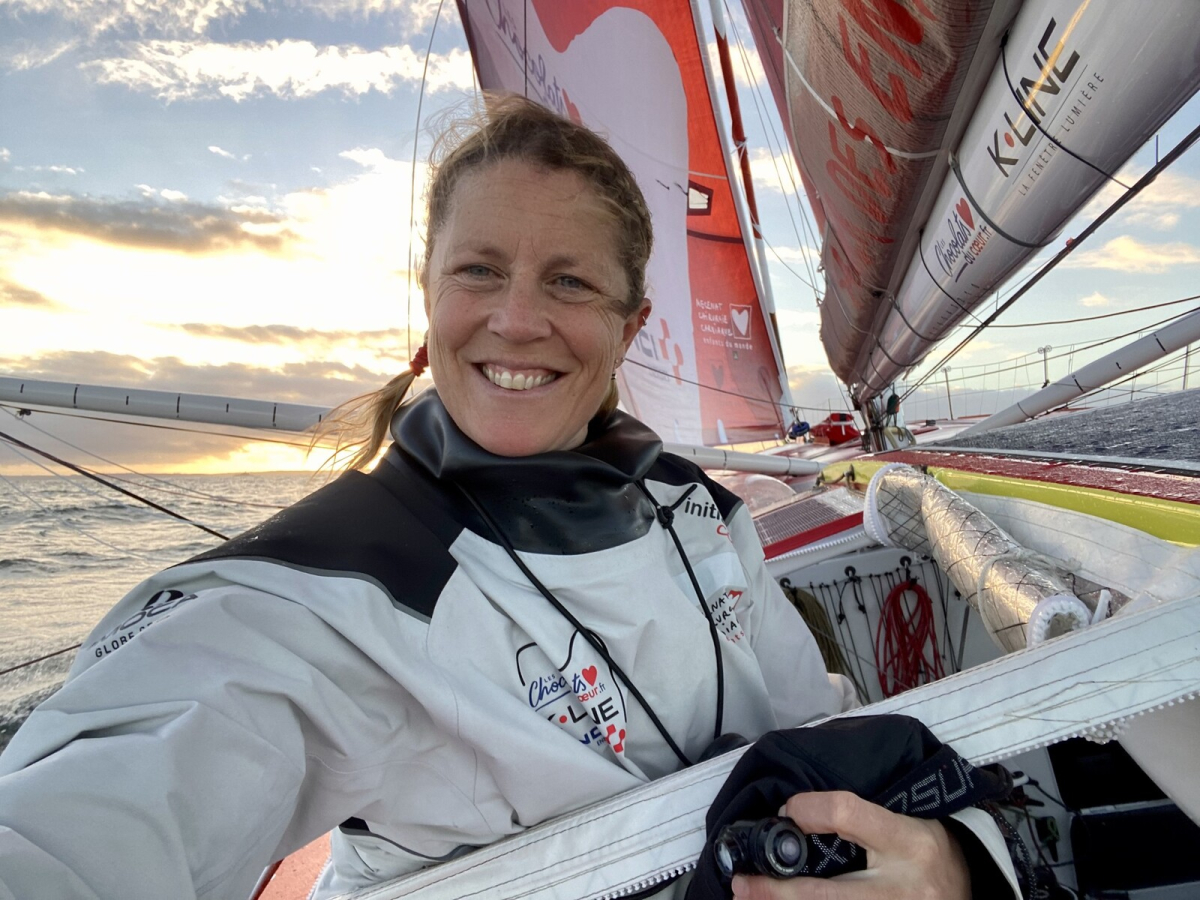 Sam Davies skickar en hälsning från andra solnedgången ute till havs. Foto: Sam Davies / Initiatives-Cœur