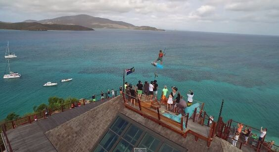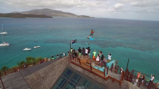 Vi har sett våghalsiga hopp med kite förr och här är ytterligare ett imponerande trick. Kitesurfaren Nick Jacobsen startar från högsta punkten (från taket) på Richard Bransons privata ö.
