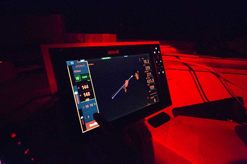 Månen har succesivt blivit mindre varje natt och nätterna mörkare allteftersom vi seglat västerut. GPSen säger att månen i natt är 0%, det är becksvart. Vad kallar man en måne som inte alls är belyst? Nymåne känns fel. Nyss var det så mörkt och stjärnklart att vi såg en planet lysa upp en gata på vattenytan, en ”planetgata”, fint ord. Vädret är lugnt men vi har på känn att något är på gång. Nyss ändrades temperaturen något och luften blev fuktigare, när vi tittar bakåt ser vi att delar stjärnhimmeln ersatts av ett luddigt intensivt mörker, det är som om mörk materia bereder ut sig över stjärnhimmeln och suger upp all energi. Vi får en plötslig vindkantring, ett vrid på ungefär 20 grader, vinden tilltar något i styrka. På radarn ser vi hur två röda fläckar bildas och snabbt tilltar i storlek. Första gången vi ser dom är de på fem sjömils avstånd, när Philip kommit upp från soffan ett par minuter senare är de på tre sjömils avstånd. När vi ytterligare fem minuter senare rullat in kodnollan och satt genuan är ovädren knappt en sjömil bort och det har börjat regna ganska kraftigt.