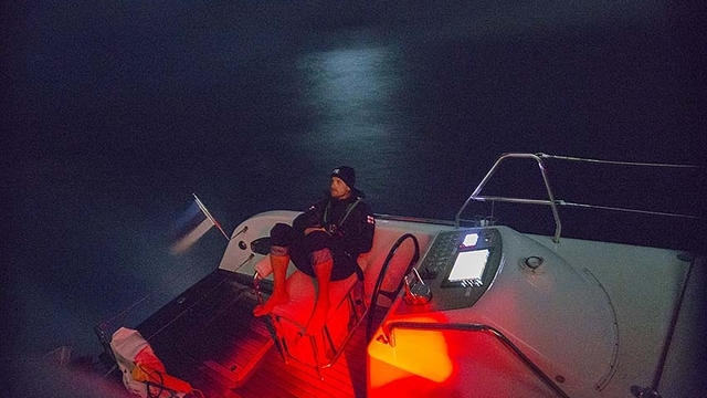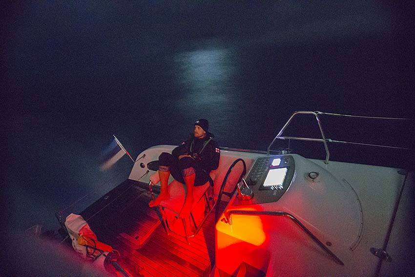 Vi sitter slappt tillbakalutade och stirrar ut i den mörka, stjärnklara natten. En efter en försvinner stjärnorna bakom oss och ett ännu mörkare mörker bereder ut sig. Det har vridit emon 20 grader sista minuten, vi känner ett par stänk av varmt fint duggregn. På radarn bildas två aggressiva röda fläckar, en strax i lovart, en strax bakom. De ändrar snabbt form och för varje radarsvep blir de större och närmar sig snabbt. Vi väcker kapten Philip som sover på soffan i salongen, här gäller det att vara beredd...