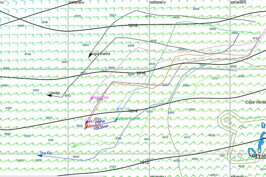 Vi gippade på vårt förväntade högerskift igår. Vi tjänade lite på konkurrenterna framför oss men inte alls lika mycket som vi förlorade när vi låg stilla och arbetade med att lossa fisknätet runt centerbordet. Allteftersom vi har seglat söderut har vädret stabiliserats och det har blivit mer lättseglat. Vi har bytt från Code0 (eller vad det nu skall kallas?) till A4 och funderar på att byta till A2 om det lättar ut ytterligare som en del prognoser förutspår. Med nya prognoser har vår strategi ändrats något. Vi har positionerat oss något söder om våra konkurrenters linje och vi har nu gippat till styrbord och styr nu i princip rakt mot Saint Lucia, bäring 282°.