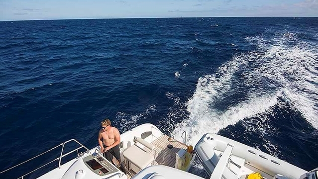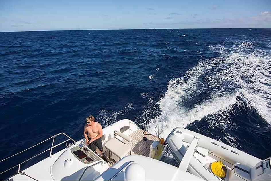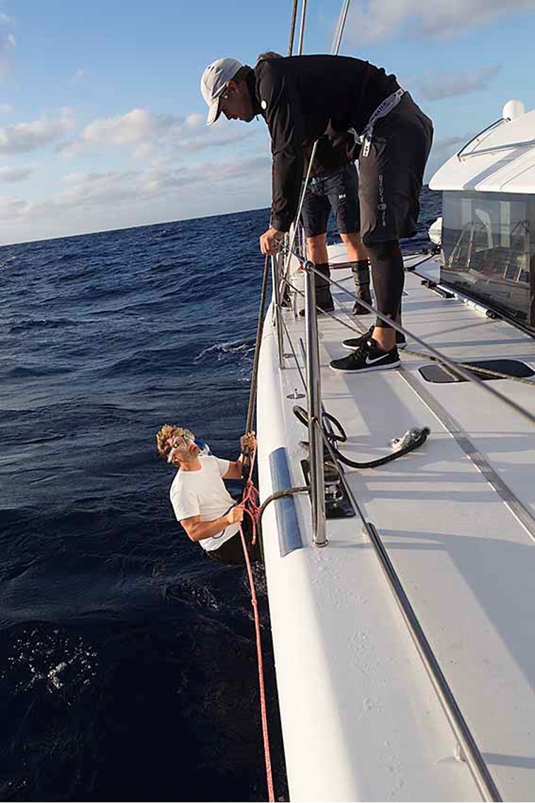 Strax efter gryningen mojnar det, vi väcker alla som behövs för jobbet, alla får vakna till, vi pratar igenom planen flera gånger så att alla har en klar bild över situationen och vad vi vill åstadkomma. Gör vi detta rätt borde det vara relativt lätt att få bort tampen utan risk att skada båt eller riskera att förvärra situation. Planen är att Philip kopplas till ett fall, en tamp akterut och en tamp förut. Vi tar ner gennakerrn, drejar bi och sänker ner Philip till vattenbrynet, vågorna är relativt  lugna just här och han kan dyka ner och verifiera att vår teori stämmer. Det gör den, han försöker lösgöra tampen för hand men den sitter alltför hårt inkilad. Vi drar tampen hela vägen fram till ett block som vi riggar under peket bak till en vinsch. Vi behöver bara vinscha lite lätt och tampen lossar. Hela besättningen jublar och ger varandra high-fives.