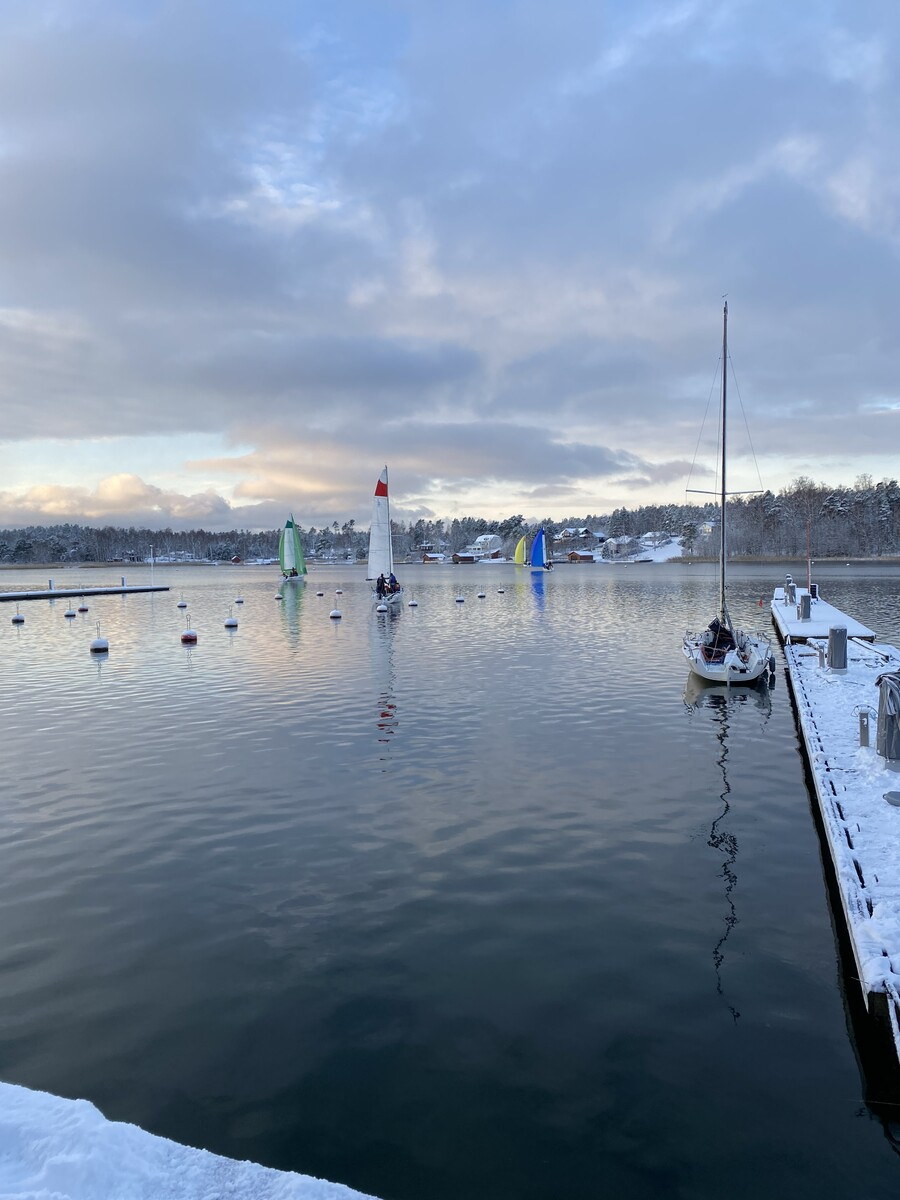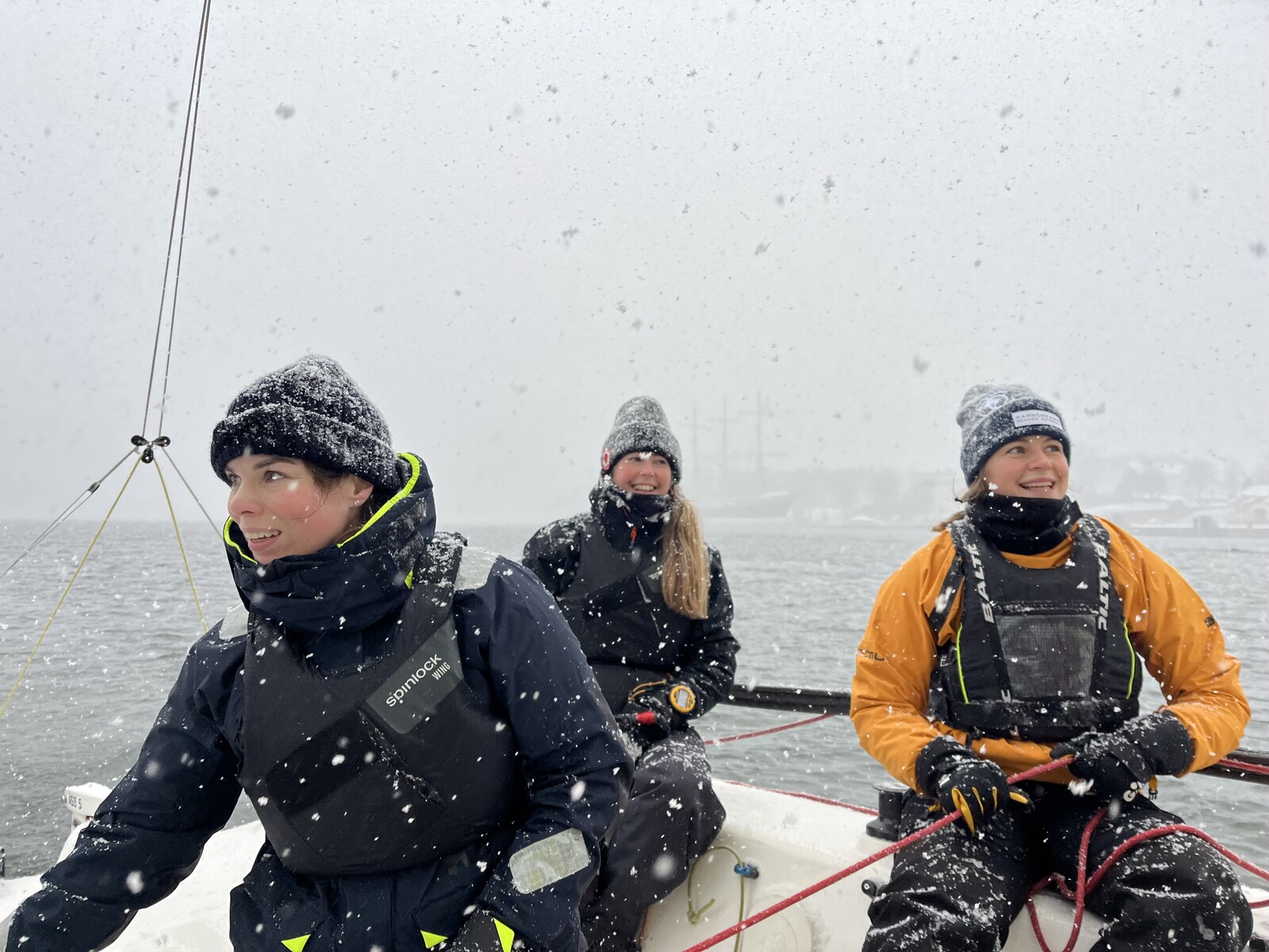 Karin Fernström och hennes lag var på Åland och seglade J/70 i full snöstorm i slutet av november. Hon berättar att laget hade på sig fler lager än när de åker skidor! Fyra lager av kläder under seglarställen, raggsockor och ull. Ändå var det kallt ute på vattnet. Laget höll värmen uppe genom rörelseövningar ombord och kunde som tur är komma in och värma sig med glögg mellan seglingarna.